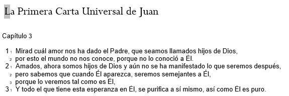 Esta es la tercera edición de la serie, Biblia que podría ser perfectamente la última de la serie LSBF, sino fuera por los elementos de cambio de gran calado, que debe contener la próxima LSBF 2023 y la última edición de la serie, LSBF 202[..]. Salvo aquellos, LSBF 2021 contiene todos los elementos propios del < Sistema de Ordenación LSBF >. A continuación, transcribimos casi totalmente la introducción que de esta edición aparece en lasantabiblifacil.es: INTRODUCCIÓN A LA SANTA BIBLIA FÁCIL 2021 Primero veamos como botón de muestra, un párrafo en LSBF, cómo lo he ordenado sobre la página y también como lo he numerado. A continuación, veremos cómo se leen los tres versículos de ese mismo párrafo y también como se enumeran. Y así, de esta misma manera se escribe y se lee todo el Texto bíblico. Para ello, he elegido un párrafo completo con versículos que contienen un número variado de versos numerados, (renglones). Es este: 1 Juan 3: 1-3 (Primera de Juan, capítulo 3, versículos del 1 al 3). Así se escribe este párrafo (que contiene tres versículos, y seis versos-renglones) en La Santa Biblia Fácil ![]() Y así se leen, se escriben, y se numeran los versículos de este párrafo Versículo 1 (primer renglón del párrafo): primera de Juan, capítulo 3, versículo 1, verso 1. Jn 3: 1: 1. Versículo 1 (segundo renglón del párrafo): primera de Juan, capítulo 3, versículo 1, verso 2. Jn 3: 1: 2. Versículo 2 (tercer renglón del párrafo): primera de Juan, capítulo 3, versículo 2, verso 1. Jn 3: 2: 1. Versículo 2 (cuarto renglón del párrafo): primera de Juan, capítulo 3, versículo 2, verso 2. Jn 3: 2: 2. Versículo 2 (quinto renglón del párrafo): primera de Juan, capítulo 3, versículo 2, verso 3. Jn 3: 2: 3. Versículo 3 (sexto renglón del párrafo): primera de Juan, capítulo 3, versículo 3, verso 1. Jn 3: 3: 1. En la anterior presentación, PRESENTACIÓN DE LA SANTA BIBLIA FÁCIL 2021, hable figuradamente de lo que es el “Génesis”, “Éxodo”, “Levítico”, “Números”, “Deuteronomio”, y “Josué” del proyecto global LSBF, hasta este momento. Ahora, continuaremos con otras generalidades de LSBF, y con algunas que son características comunes a todas las BIBLIAS de la serie LSBF, salvo a la primera. Y lo haremos, con especial atención a las particularidades propias de La Santa Biblia Fácil 2021 que tienes en tus manos. Ahora, usaré lo que queda de esta página, más las dos siguientes, para exponerte de forma sintetizada, las características únicas que distinguen a LSBF 2021. Y mostrándote el alma, el corazón y sus entrañas, responderé a algunas preguntas que pudieras tener, como: ¿por qué, para qué, y cómo se ha hecho de tal forma, este o aquel aspecto. ¡Mi deseo es que te complazca y aprecies las razones de su pertinencia! LOS TEXTOS BASE, es decir, las versiones bíblicas desde donde se partió para “ESCRIBIR” LSBF 2021 A continuación, están las Biblias usadas como base para la nueva ordenación, actualización, y la revisión del leguaje (vocabulario), la gramática, y la ortografía. Aunque han sido diversas, he mantenido la fidelidad y preferencia al Textus Receptus, pues, es el patrón elegido desde el principio para este trabajo: • La Santa Biblia fácil 2019: fiel reflejo de Reina Valera 1909, desde la “Biblia del Oso” Casiodoro de 1569. • El Nuevo Testamento Fácil 2020: revisado de LSBF 2019, con traducciones de RV, y otras muchas… • La Santa Biblia fácil 2021: revisado desde el NTF 2020, con RV 1602, RV 1862-1865, RV SBT y otras… También con otras traducciones como: LBLA, NBLA, BTX, BDJ, BSA, BNC, BKadosh, BPeshita, y otras… EL FORMATO DEL LIBRO, utilizado en esta edición para LSBF 2021 La dificultad en esto radicó en equilibrar o armonizar de la mejor forma posible, los elementos en juego incluidos en el formato general, partiendo del objetivo mayor de incluir un tamaño grande de letra, y sin que afectara en exceso al resto, sabiendo que debía sacrificar algún beneficio por otro. Fue duro batallar con el Texto, el tamaño de letra, los márgenes, los números de los versículos, el espacio entre ellos, etc. • Las medidas de la cubierta son de 25 cm de alto, y 18 cm de ancho, con una doble solapa, para hacer el Libro consistente. El margen de la caja es de 1,5 cm izquierda-derecha, y de 2,0 cm el superior-inferior. • El papel es < papel biblia >, para más de 1.500 páginas es lo mejor técnicamente, y el papel tradicional. • La tipografía escogida para Texto bíblico es arial 10, suficientemente grande para una lectura agradable. • La Palabra, está perfectamente alineado, es decir, al trazar una línea recta de arriba abajo de la página comprobaremos que el comienzo de los versículos está pegado a la línea trazada imaginariamente. • La numeración de LSBF a parte de los tradicionales capítulos y versículos de la BIBLIA, contiene versos numerados como ya como ya hemos explicado, pero todos están perfectamente alineados en el margen izquierdo de la página, no interfiriendo la lectura de la Palabra de Dios, para visualizarla muy claramente. LOS PÁRRAFOS, formados con todos los versículos de toda la BIBLIA Aquí la dificultad radicaba en agrupar en un párrafo, aquellos versículos que, junto a otros, forman una “unidad de pensamiento completo”, aunque en muchísimos casos el propio Texto lo deja ver con claridad, en otros muchos el esfuerzo fue mayor, pero trabajar en todos ellos fue una autentica delicia, porque al agruparlos así, por su propia homogeneidad y armonía, respondían a lo que este autor piensa pudo ser lo más parecido a la transmisión de la Palabra a los autógrafos. La mejora de este aspecto del trabajo consistirá en subir y/o bajar aquellos versículos que deban “pertenecer al párrafo” anterior y/o posterior. • Las transiciones naturales del Texto, me ayudaron a determinar cuando debería iniciar un nuevo párrafo. • El